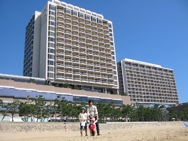 ホテルを出て、目の前のビーチを散策。海が とてもきれい。また、ほとんどゴミが落ちていない。このときに限らず、赤ん坊を抱っこしていると、席を譲ってくれる、みんなが話しかけてくれる等、韓国人 はマナーがいいという印象を受ける。