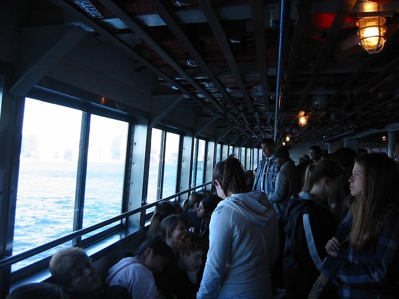8:30の少し前から乗船が始まり、行列が動き出した。空港と同様の手荷物検査を受け、8:30バッテリーパーク発の第一便に無 事乗船することができた。学校行事で来ているのか、学生の団体が多 い。フェリーからの眺めは最高。早起きして来た甲斐があった。