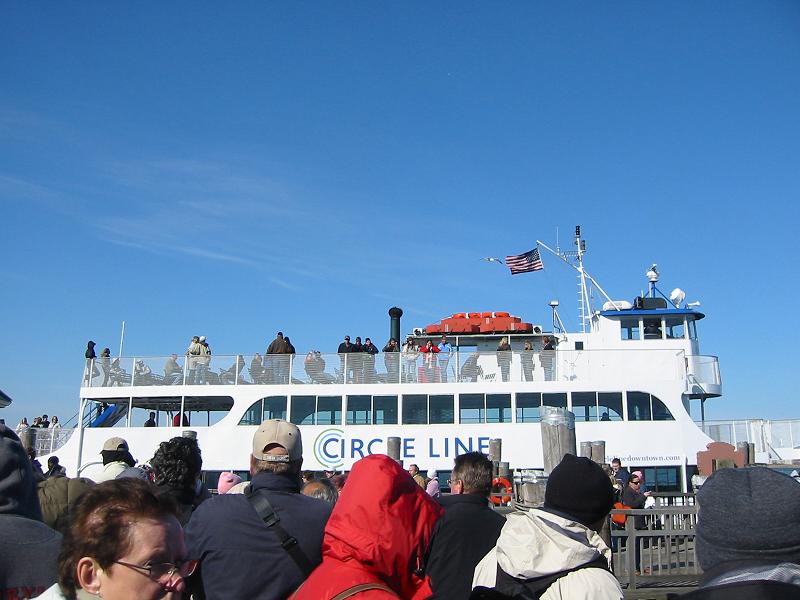 8:00にキャッスル・クリントンの入口が開放され、自由の女神とエリス島行きのサークルライン(Circle Line)というフェリーののチケットを11.50ドルで購入。そして、今度は、自由の女神とエリス島行きのフェリー乗り場へ向かう。すでに100人ぐら い行列ができていた。8:30の第一便に乗れるかどうか心配になってくる。待っている間、しゃれにならないぐらい寒い。