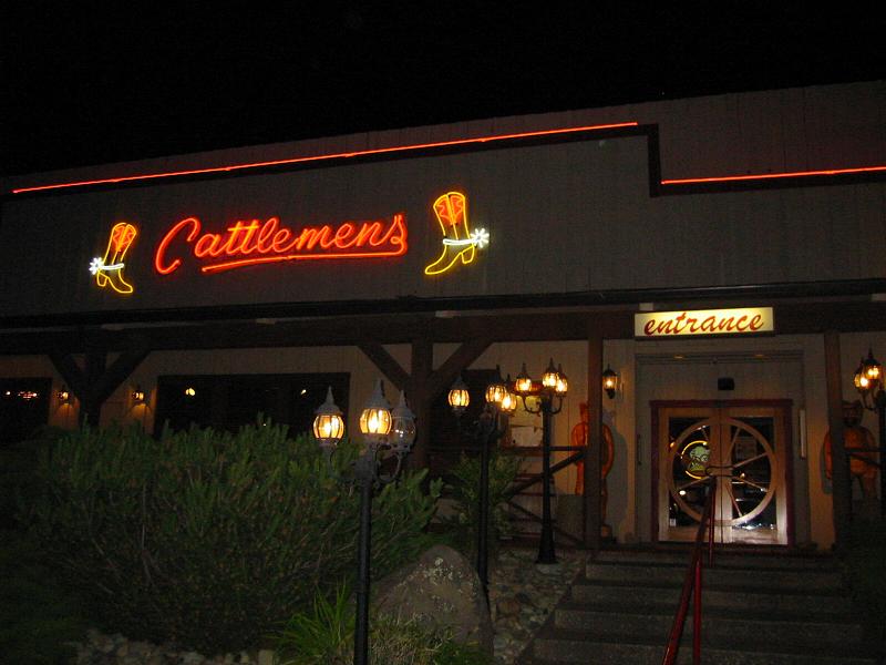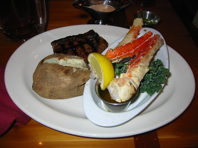 キャトルメンズ(Cattlemensというステーキハウスで夕食。アメリカのステーキはとにかくデカい。食べきれないともったいないので、ステーキを小さめにして、カニとベイクド・ポテトのセット(下の写真)を頼んだ。お店の雰囲気は、西部開拓時代と彷彿させる。
