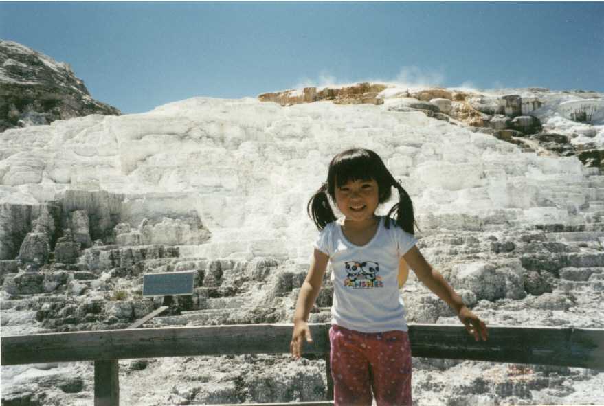 メイン・テラス(Main Terrace)前の駐車場に車を停めて、キャナリー・スプリング(Canary Spring)までトレイル(Trail)を散策。なかなかきれいだけど、目の前の木がじゃまで、いい写真は撮れない。自分たちの目で見て感動できればいいんだけどね。残りのテラス(Terrace)はたいしたことはない。写真だけ撮って、すぐ移動。14:30、マンモス・ホット・スプリング(Mammoth Hot Spring)発