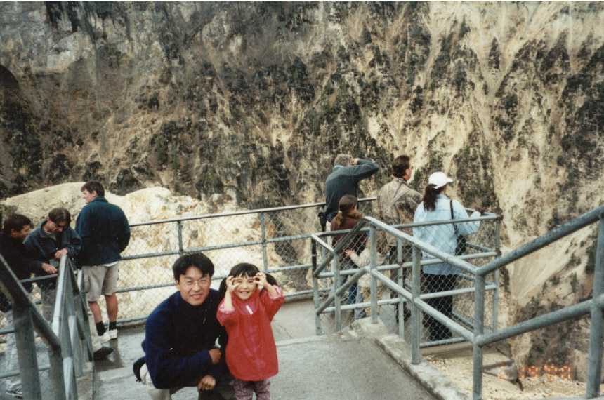 相変わらずキャニオン(Canyon)では雨が降っていたが、ノースリム・ドライブ(North Rim Drive)に入り、ブリック・オブ・ロウアー・フォールズ・トレール(Brick of Lower Falls Trail)の駐車場に止める。小雨になっていたので、子供をおんぶして、急いでトレール(Trail)を下る。ロウアー滝(Lower Falls)を間近で見る。今日は雨ということもあり、水量が多く、すごい迫力だ。上流の川はもうあふれそうだ。早く帰った方がいいのかな。でも、ここまで来れてよかった。帰り道も子供をおんぶ。標高が高いせいか疲れやすい。もうくたくた。