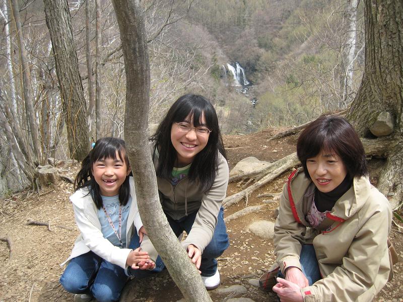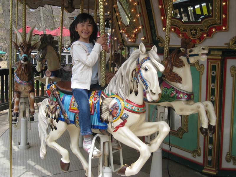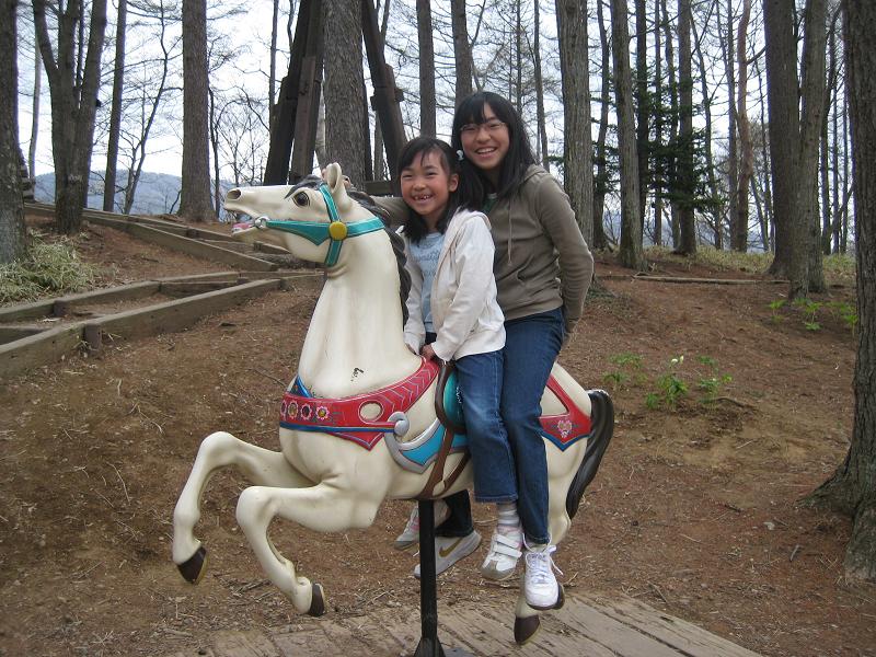 滝見の丘に到着。遠方に千ヶ滝が見える。次に、森のメリーゴーランドまで遊歩道を散策する。次女がメリーゴーランドに乗った。その後、萌木の村広場を横断。