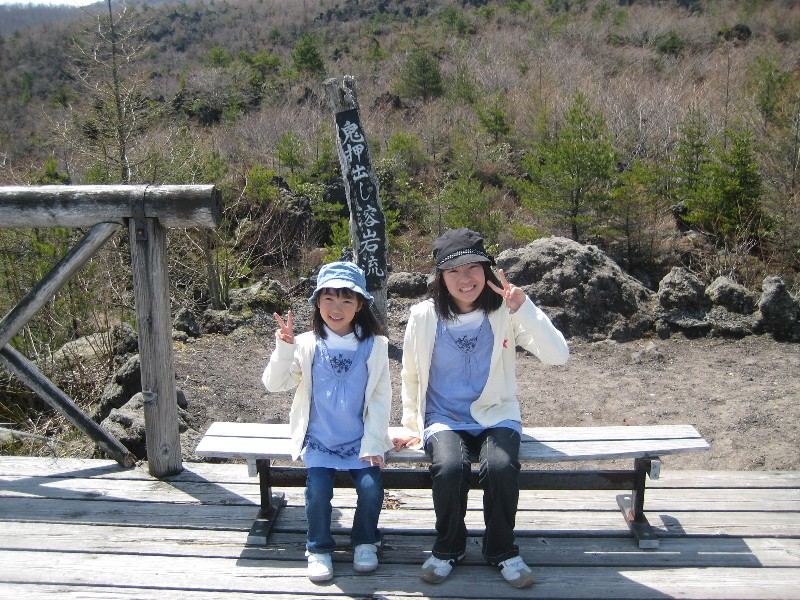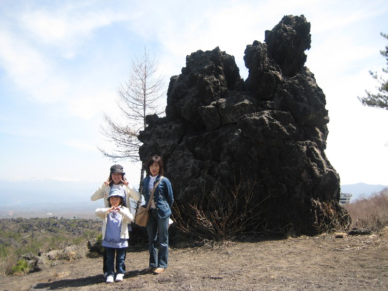 見晴台か ら鬼押出し園を眺めつつ、記念撮影。この後、浅間火山博物館の駐車場から鬼押出し園の駐車場へ車を移動させた が、入場料がかかるし、たいして代わり映えしないので、そのまま引き返すことにした。白糸の滝が近く にあるが、昨年、富士山麓の白糸の滝に行ったし、今回は時間がないので、パスすることにした。