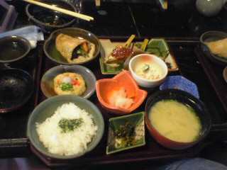 こうの湯を出て、観光案内所の向かい側にある「とうふ吉祥」へ向かう。入り口で10分ほど待っただろうか。有名人のサインがたくさん飾られている。店に入って、1,600円の梅定食を注文する。豆腐とごはんが食べ放題。でも、結構ボリュームがあり、それぞれ1回ずつおかわりしただけでおなかいっぱい。