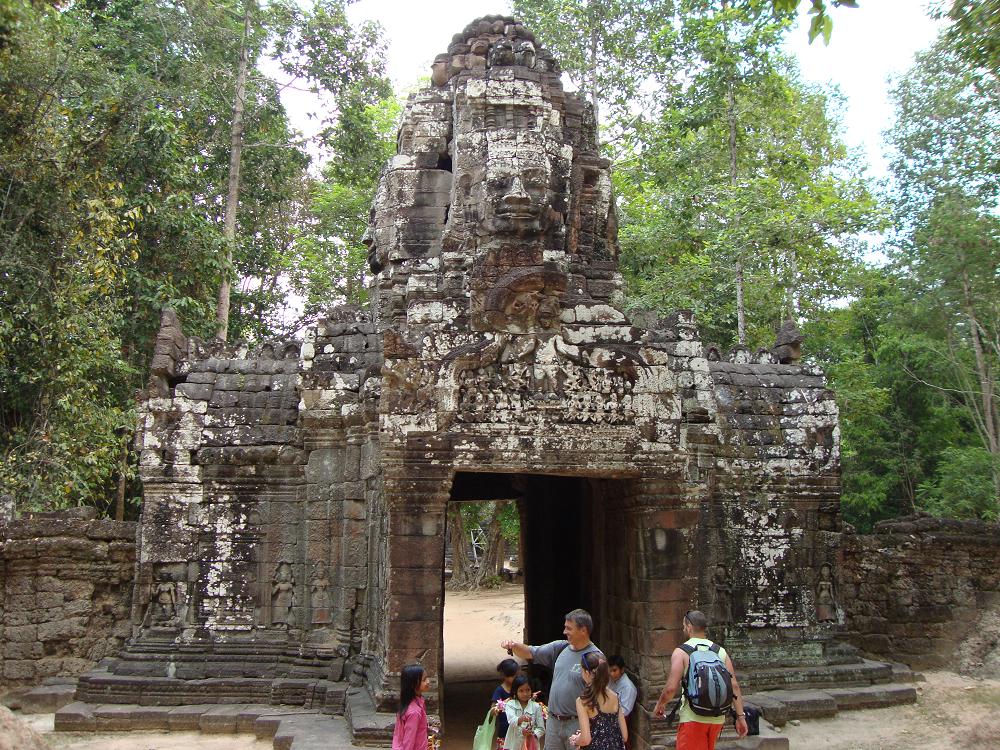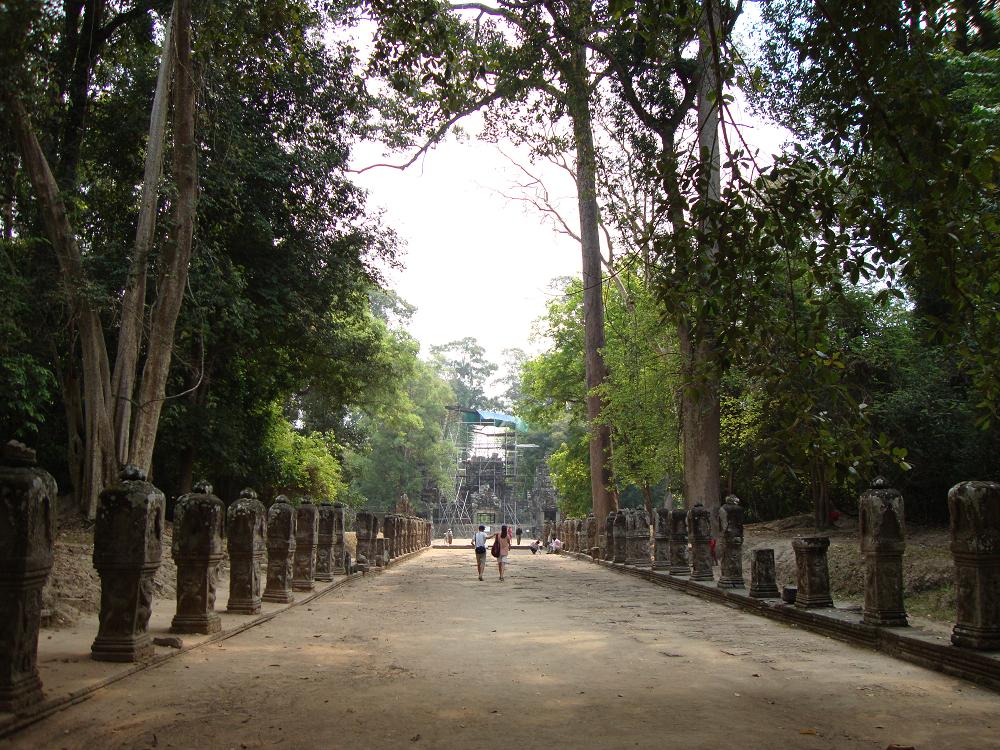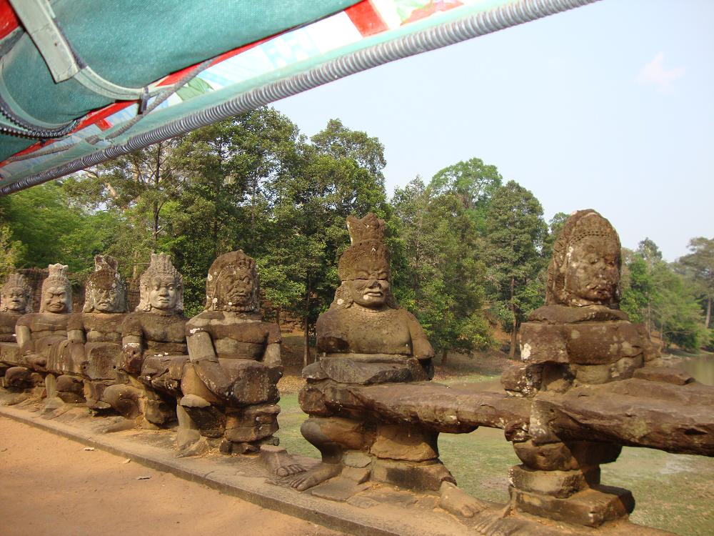行きに来た道をそのまま引き返し、タ・プローム・ホテルのすぐ横を通過し、シェムリアップ市街に入る。シヴォタ通りを北上し、 アンコールトムの南大門を通過。バイヨンを横目に見た後、北大門を通過。ここまで来ると周囲はまさにジャングルで、大自然がそのまま残されているところが い い。