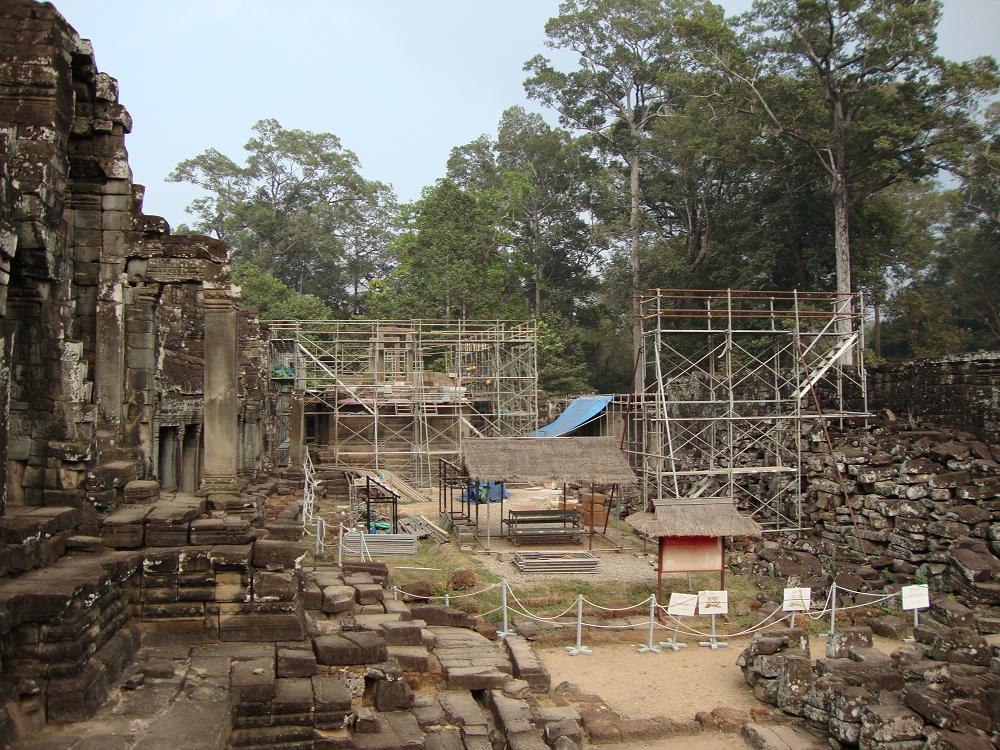 東門から入り、地球の歩き方に掲載されている第一回廊のレリーフを見物しようと思ったが、工事中のエリアにほとんどのレリーフが集中していて、見ることができなかった。バイヨンのレリーフは、日本の ODAで復元しているらしく、現地のガイドが外国人観光客へしきりに日本がお金を出してくれていることに感謝していると連呼していた。ODAなど単なる税 金の無駄使いかと思っていたが、必ずしもそうではないと感じた。