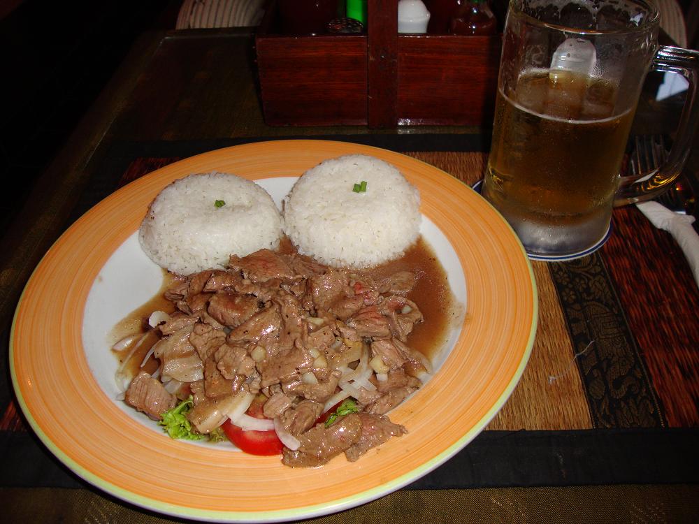 パブ・ストリートのレッド・ピアノで夕食。赤が基調のインテリ アで、外国人観光客に人気があるというベルギー料理店。隣りのテーブルを見ると、両腕に日本語の刺青をしたスキンヘッドのネオナチ風の白人青年がワインを 飲んでご機嫌の様子。牛肉とごは んとビールを頼む。4.25ドル。ここもなかなかおいしい。