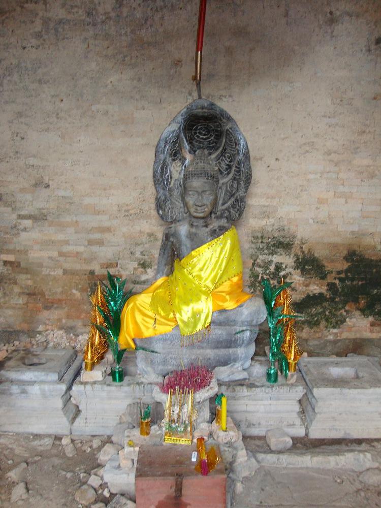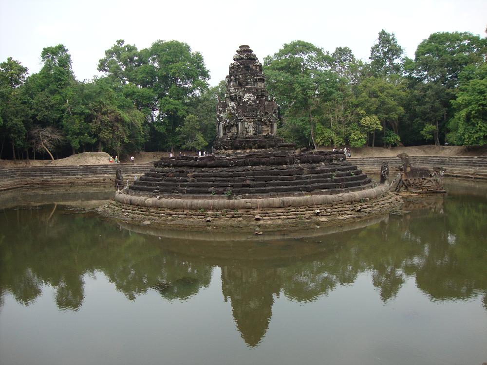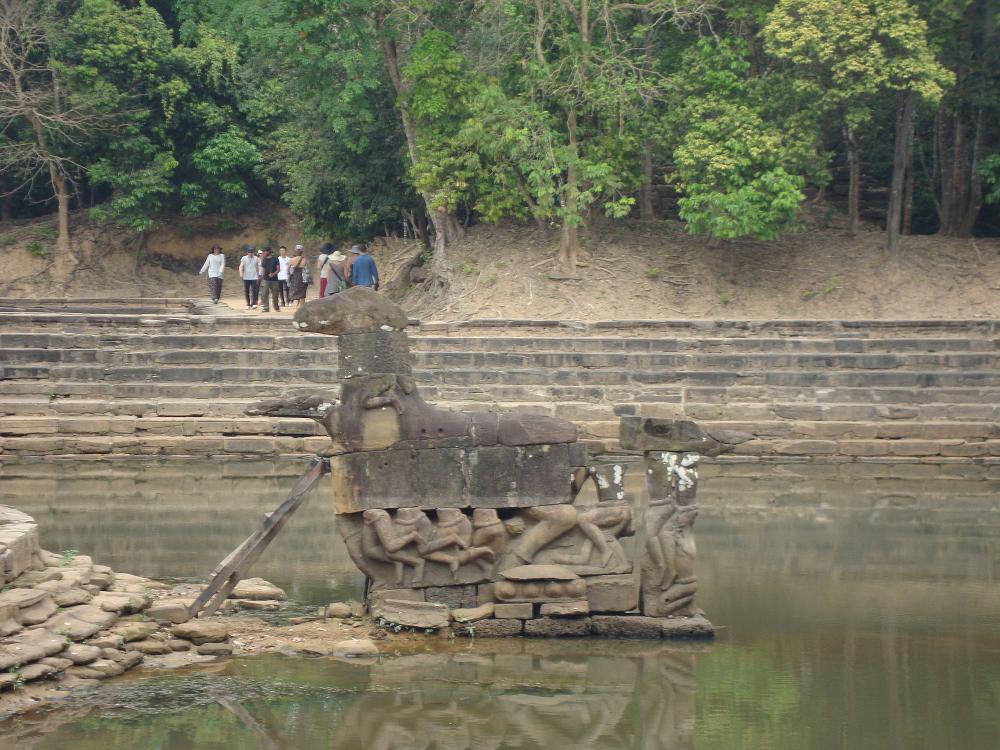 13:30、レストランを出て、ニャック・ポアンの遺跡を見物。ニャック・ポアンは小さい遺跡で中央祠堂を囲む池を一周するだけ。観世音菩薩の化身と言 われるヴァハーラがある。天を駆ける神馬の下部には18人が しがみつい ている。ここで、日本人観光客に声をかけられ、写真を撮ってあげた。