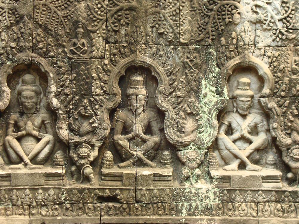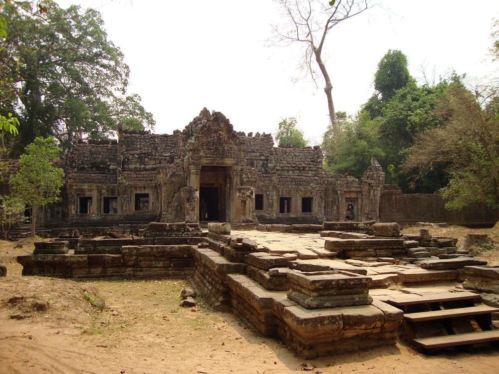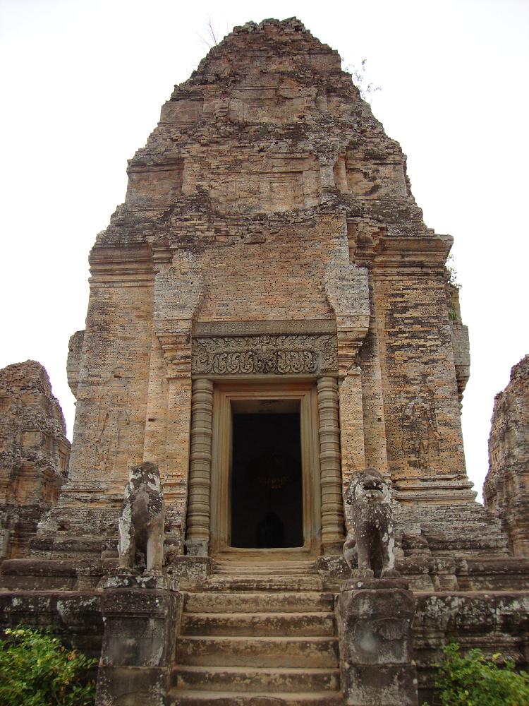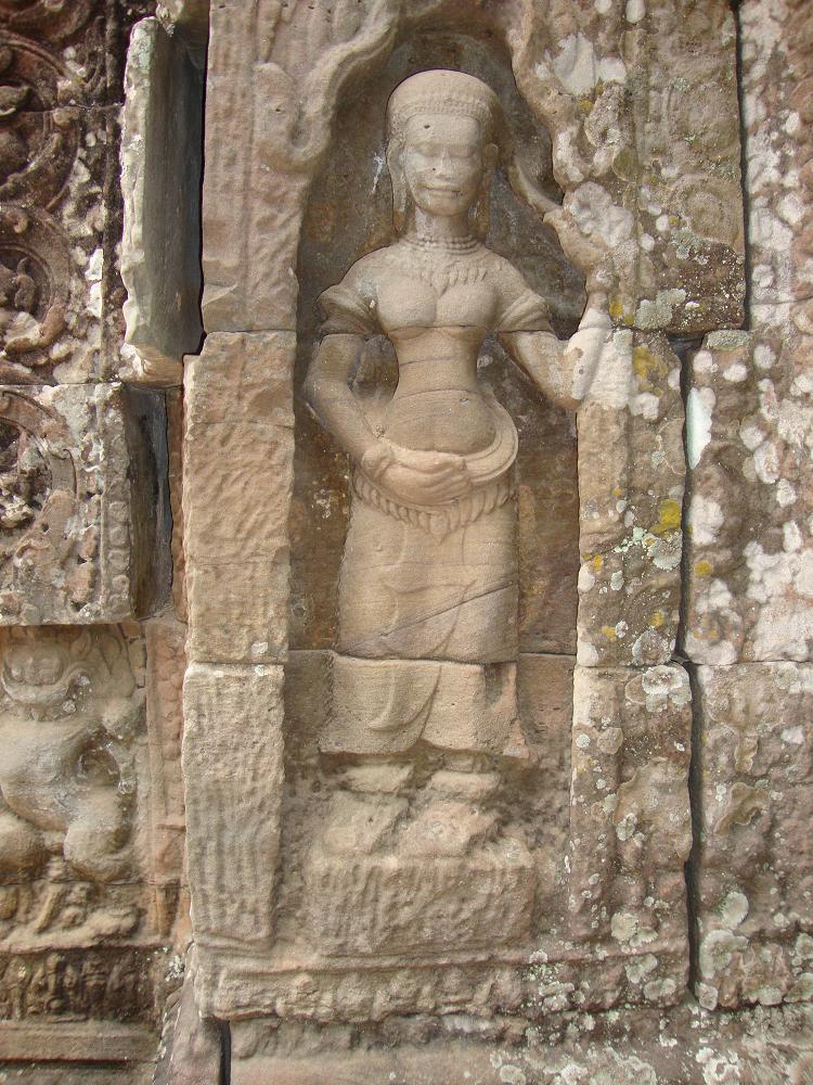 プリア・カンの西塔門へ向かう道中、子供たちが物売りに来るが、観光客がとても少ない。西塔門までの参道の両側に、リンガを模した彫刻が並んでいる。西塔門を通過すると、プリ ア・カンの建造物が見えてくる。西門の上部のレリーフが印象的だ が、総じてプリア・カンのレリーフは彫りが深い。踊り子の テラスには、「13人の踊るアプサラのレリーフ」がある。中央祠堂には建造当時は観世音 菩薩が祀られていたそうだが、現在は16世紀頃に建立されたス トゥーパが祀られているとのこと。