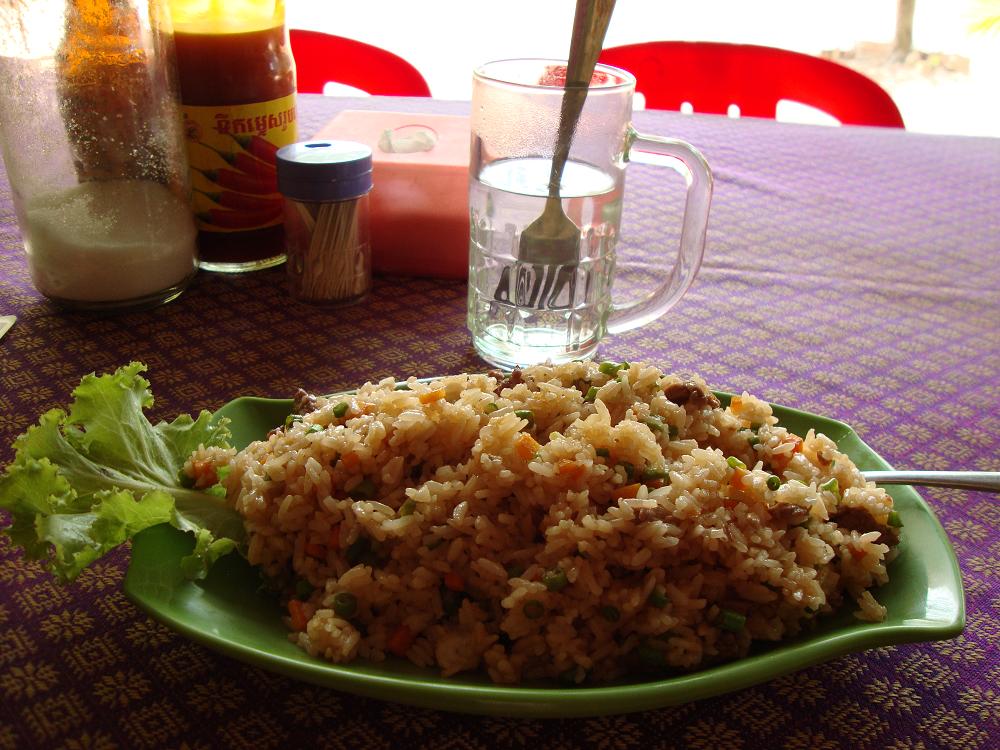 ニャック・ポアンに到着。トゥクトゥクが駐車場に停車すると、屋台村のレストランへ案内される。牛肉とフライドライスを注文。4.5ドル。値段は高い が、昨日のアンコール・ワットよりおいしい。