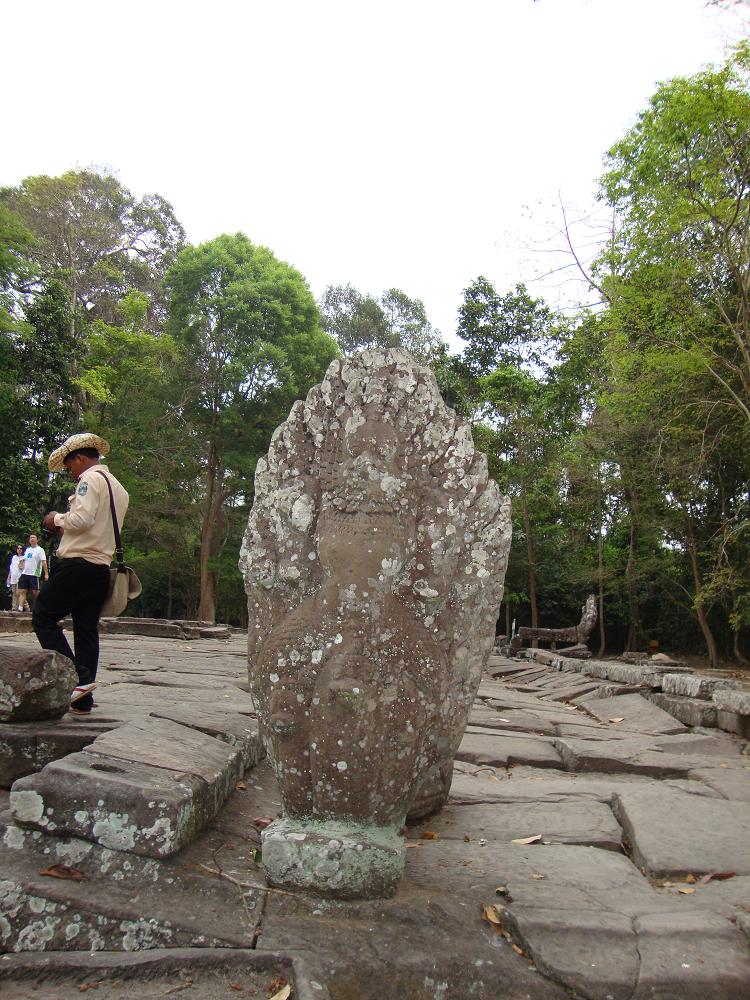 プリア・カンにも、タ・プロームのようなスポアンの木が ある。地球の歩き方には、東第二塔門の裏側は美しい彫刻の壁と書かれているが、残念ながら、ほとんどの仏像が破壊されていた。東第ニ塔門から外へ出ると、 大きなナーガ像がある。東塔門を出ると、西塔門と同じく、 参道の両側に、 リンガを模した彫刻が並んでいる。トゥクトゥクのドライバーが待つ駐車場まで、ジャングルの大自然の中をのんびり散策する。
