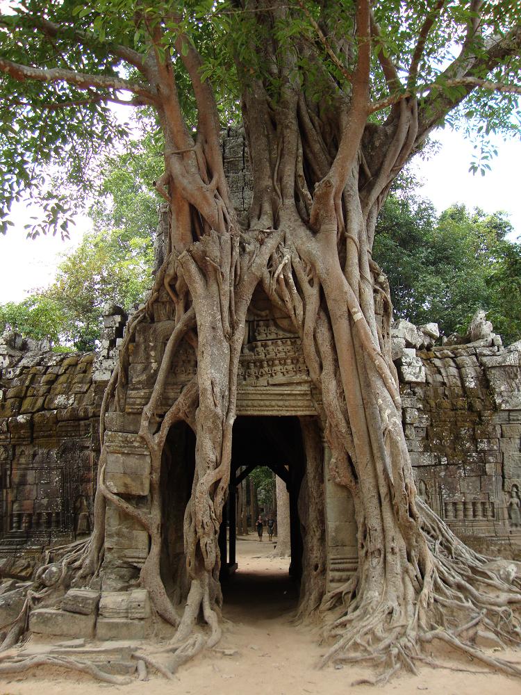 タ・ソムの西塔門には、観世音菩薩が埋め込まれている。表情はバイヨンと同じ。タ・ソムの西門から中へ入ると、中央祠堂を囲むように、四角形の通路があ る。一旦、東門から外へ出て、東塔門へ向かう。東塔門はリエップと いう高木の根に覆い尽くされている。