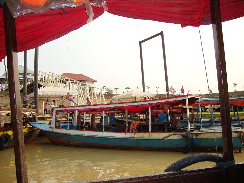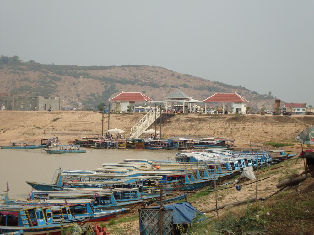 クルーズ船乗り場付近には、多数のクルーズ船が並んでい る。トンレサップ湖付近の屋台村がはるか上の方に見える。3 月は乾季の終わりのため、トンレサップ湖の水深は 1.5mほどしかないそうだ。雨季の終わりには水深10mになるという。クルーズ船が通過する川幅が非常に狭く、大型のクルーズ船(主に、韓国人観 光客が利用している)が通過すると、大きな波がやってきて、小船が大きく横揺れする。