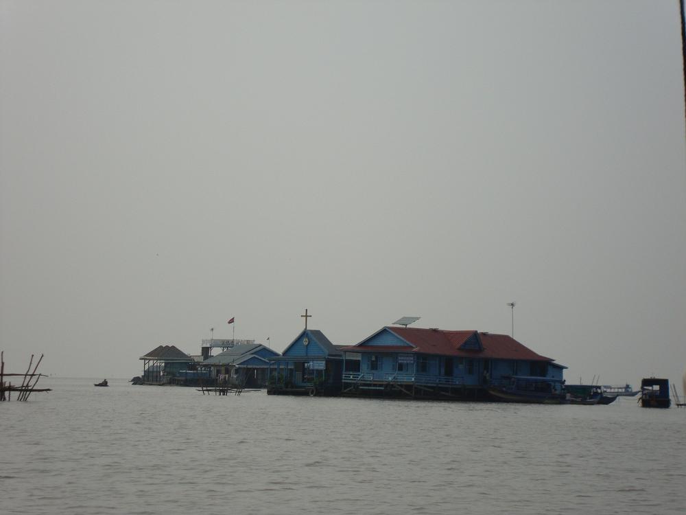 川幅が狭いところを大型のクルーズ船をよけながら進んでいくと、トンレサップ湖の水上住宅街が視界に入ってくる。となりのガイドの声に力が入ってくる。 1つのボートに1家族が生活している。一般住居だけでなく、スーパーマーケット、レストラン、学校もある。カンボジア人の多くは仏教徒だが、キリスト教会もある。確かに建物の屋根に十字架が付いている。