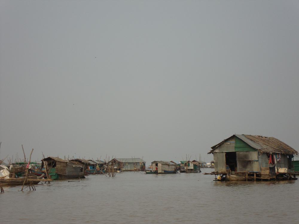 こんな風景を見ていても退屈だし、ここまでやってきたことだけで満足したので、とっとと湖岸に戻って残りの遺跡を巡りたいと思い始めたとき、ガイドから 「感想は?」と聞かれた。思わず「つまらない」と言い掛けたが、気を取り直して「トンレサップ湖は大きいねえ〜」と答えると、ガイドは機嫌を 良くし、トンレサップ湖の解説を始めた。今は乾季だけど雨季になると面積が3倍になるとか、水深が浅いしピラニアもいないから泳いでも大丈夫とか、プノン ペンまで船で行けるよとか。