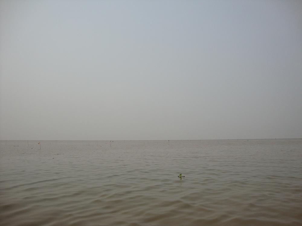 トンレサップ湖の水上住宅街を抜けると、ここがクルーズの最終地点だ と言われ、クルーズ船のエンジンが停止する。見渡す限り水平線が広がる。湖面の水は泥水で濁っていて、空気は汚れていて、それ以外に何も見えない。 はっきり言って、素晴ら しい眺めとはお世辞にも言えない。