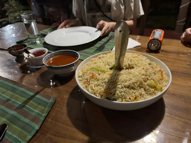 (大皿のフライド・ライスを分け合う)