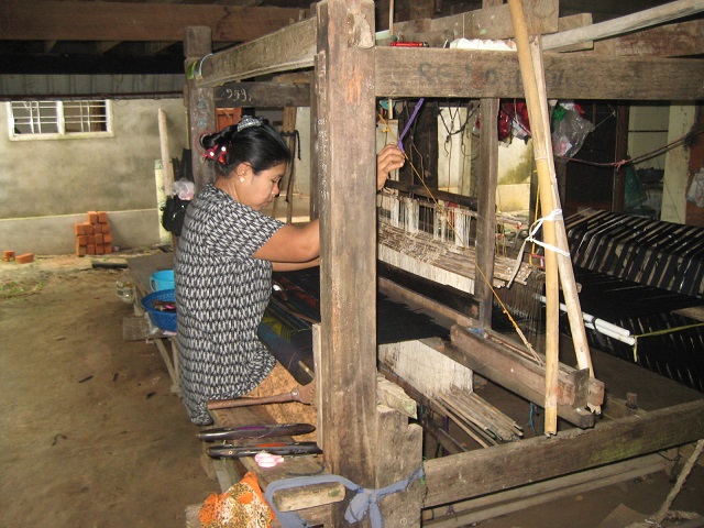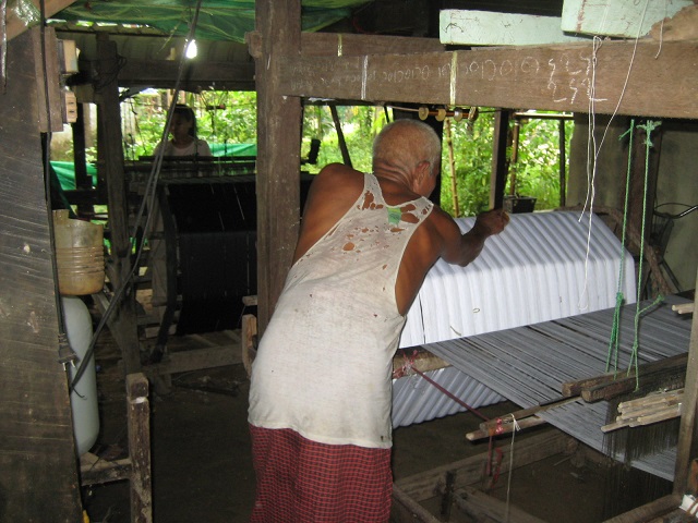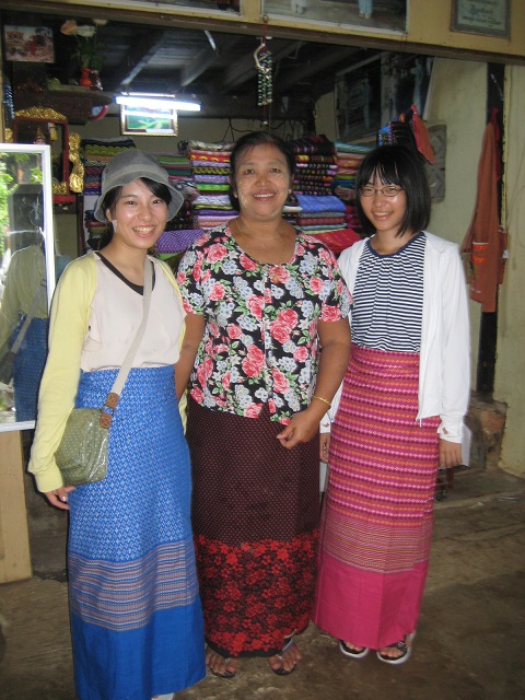 モン族の集落に到着。機織りでロンジーを編んでいる。ロンジーとは、ミャンマーで日常的に着用されている伝統的な民族衣装。娘たちにロンジーをお勧めし てもらい、1着7,000チャット(=490円)で購入しました。