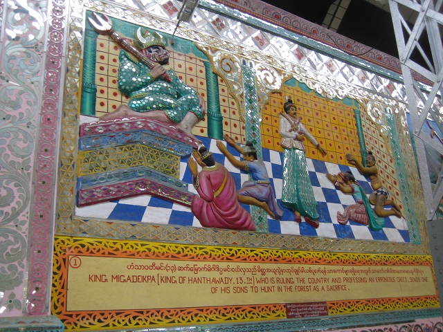 シュエターリャウン・パゴダに到着。994年にモン族のミガディパ王によって建立されたもの。背面の台座にその物語が描かれている。バゴー王朝の滅亡と 同時にその存在も忘れられ、やがて密林に覆われてしまったが、イギリス植民地時代、鉄道敷設のため視察に来ていたインド人技術者により偶然発見された。ミャーさんのガイドに従って、シュエターリャウン・パゴダの周囲を一周した。ヤンゴンのチャウダッジー・パゴダの寝仏と同じぐらいの大きさらしい。休日 だと昼食を持ち込んで過ごしている家族連れで一杯だそうだが、当日は閑古鳥。