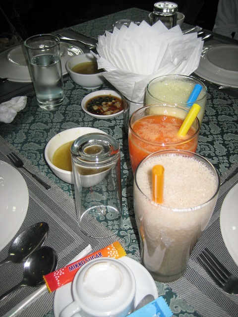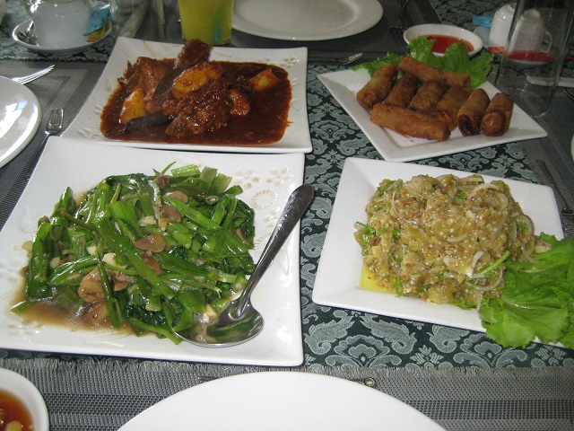 チャカワイン僧院の近くのレストランで昼食(レシートには「FR」という店名が書かれている。地球の歩き方には載っていない店のよう)。ミャーさんから ミャンマー料理を食べましょう!と言われ、チキンカレー、ポークカレー、ナスサラダ、春巻き、野菜炒め、海老チリが出てきた。客はガイドに連れてこられた 日本人観光客しかいない。日本人向けの味付けなのか、油が少なくおいしかった。ドリンクは、バナナジュース、パイナップルジュース、パパイアジュースがあ ると言うので全部注文した。